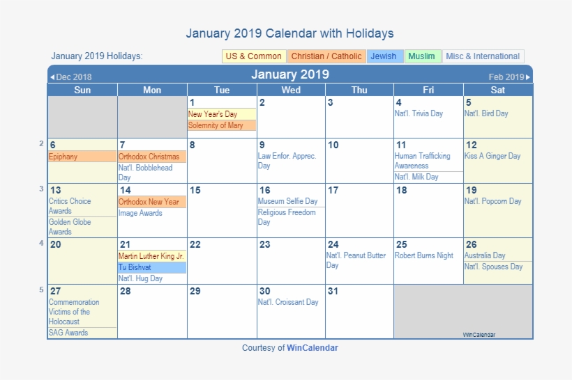 January 2019 Printable Calendar With Holidays. Print the calendar and mark the important dates, events, holidays, etc. To print the calendar click on printable format link. Those calendars come with holidays, observances, moonphases or notes space but you can easy to edit and add your own important events. You can download and print this calendar of january 2019, available in image, pdf and excel format. January 2019 calendar is a plain printable calendar. This january 2019 calendar can be printed on an a4 size paper. These perfect january 2019 calendar templates free printable daily planner changes everything. Print a calendar for january 2019 quickly and easily. Printing tips for january 2019 calendar. Our calendars are free to use and are available as pdf calendar and gif image calendar. Just click print right from your browser. Doesn't get easier than that. All the calendars are editable and printable free of cost. It will take you to the printing page, where you can take the printout by clicking on the browser print button. You can choose one of the 4 color themes.