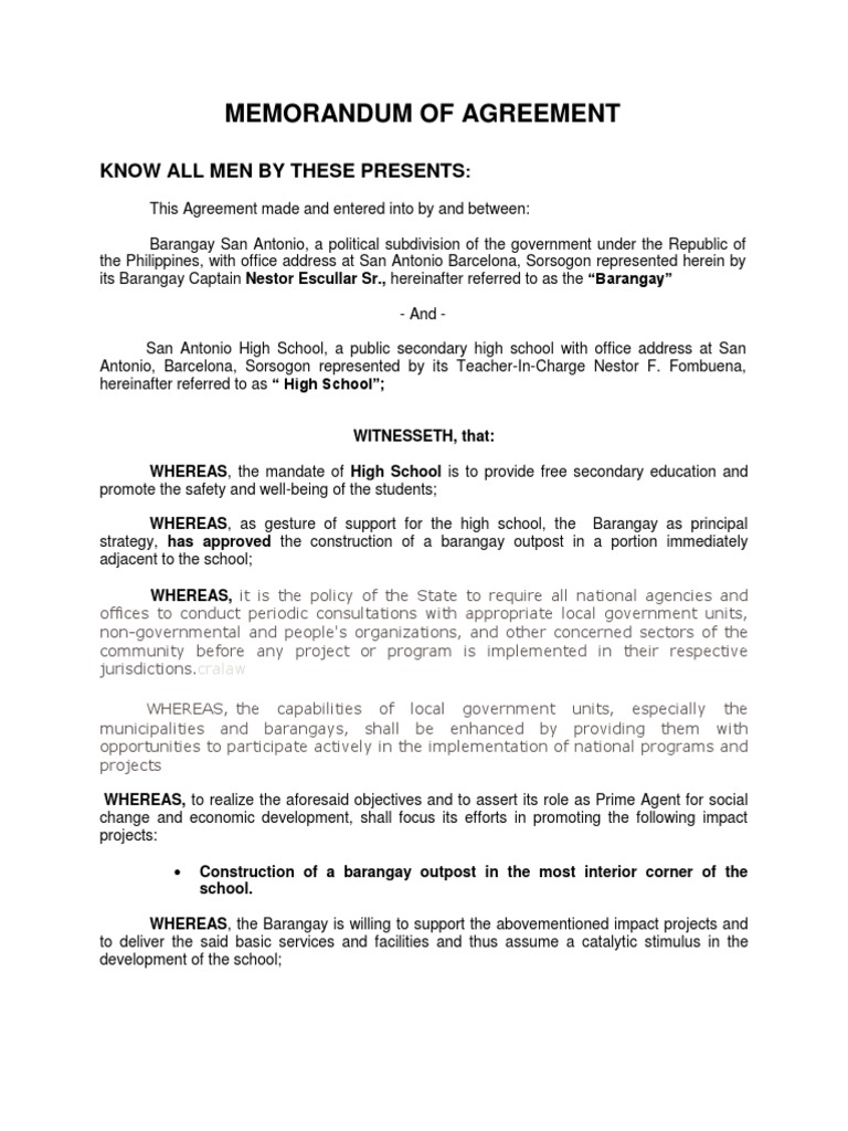 Memorandum Of Agreement Sample For Barangay. Provide a support mechanism to the barangay for the continued viability of the project pursuant to its goals and objectives ; Download free samples of memorandums of agreement covering all the relevant issues for the same that are available in popular formats like word and excel to avoid the hassle of drawing one up from scratch.you may also see partnership agreement templates. This memorandum of agreement (this moa or this memorandum of agreement) is made and entered into on this day day of month year (effective date) by and between: This memorandum of agreement (moa) template is available for free download. They're considered as binding by the parties even though they don't have legal claims. A memorandum of agreement, or moa, is a written document that describes and defines the cooperative relationship between two parties who want to work together to achieve common goals. This memorandum of agreement template is created by experts to guide in the formation of a consortium. party 1, a party 1 state of incorp company, with an office located at party 1 address; Memorandum of agreement sample online for free. 7 the legal ramifications of a mou. Every progressive person is searching for a solution that will eliminate papers and speed up the document workflow. 6 memorandum of understanding samples. Any memorandum of understanding sample would contain a mutual agreement between parties. Memorandum of agreement sample for event proposal. It can be downloaded here in a customizable word file format and edited as desired.